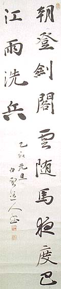紙本肉筆・・縦138.3cm、横33.3cm 「乙亥(昭和十年・1935)元旦白雲逸人書」の下 に、陰刻「青山緑川」と陽刻「白雲萬里」の落款が 押されている。野本白雲は埼玉の人で、名は實、 号を白雲・万石斎などと称し、書を岩田鶴皐に学 び、埼玉師範学校卒業後は松田南溟に師事し、 昭和11年に書芸社を創設して『書芸』や『現代書 道』を発行し、門人の養成と書道の普及を図り、 毎日書道展審査員や駒沢大学教授・大東文化学 院教授等を歴任した書家で、戦前の平凡社『書道 全集』や戦後の河出書房『定本書道全集』の編修 も担当している。 |