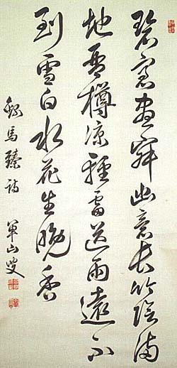 紙本肉筆・・縦125cm、横62cm 「録馬臻詩 單山叟」の下に、陰刻「高齋有常」と陽刻「單 山」の落款が押されている。高齋單山は江戸の人で、名 は有常・光正、字は子恒・精一、号を單山・三余堂などと 称し、卷菱湖に書を学んで田安家に仕え、晋唐の諸体を 究めて端正な楷行体を得意とした書家で、幕末の駐日英 公使パークスの片腕として活躍した、外交官アーネスト・ サトウ(1843〜1929)の書の師としても有名で、明治3 高林二峰らと共に、その名が記載されている。 |