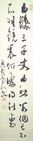 紙本肉筆・・縦137.5cm、横33cm 「奥嶺老人出」の下に、陰刻「水谷弓夫」と陽刻「 谷陰仙?」の落款が押されている。水谷奥嶺は美 濃の人で、名は弓夫、号を奥嶺と称し、漢学を神 谷簡斎に、国学を母方の祖父植松茂岳から学び 、水谷女学校や土岐郡立陶器学校(現、多治見 工業高校)等の設立に尽力した教育者で、同時に 漢詩人としても有名で、岐阜県発行『華山新誌( 明治15・16年)』には、当時の岐阜県下の漢詩 いる。 |