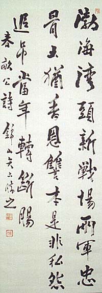 紙本肉筆・・縦130cm、横47.5cm 「錦山矢土勝之」の下に、陰陽刻の「臣勝之」と陽 刻の「實夫」の落款が押され、関防印は陽刻の「 葦竹間人」である。矢土錦山は伊勢の人で、名は 勝之、字は實夫、号を錦山と称し、初め郷里の漢 学者松田雪柯・藤川三渓らに学び、後に津藩の 名儒土井ゴウ牙の門に入り、藩校有造館の教官 となる。維新後は東京に出て漢詩の大家巌谷一 六に師事し、詩・書を善くした漢学者である。 |
