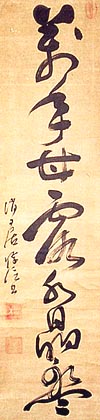 紙本肉筆・・縦105cm、横28cm 「消日居惇信書」の下に、陰刻「明義父」と陽刻回印「留惇 ?印」の落款が押されている。平林静齋は江戸の人で、名 は淳(惇)信、字は明義、号を静齋・東維軒・消日居士・桐 江山人などと称し、12才で細井広沢の門に学び、更に漢 唐の諸名家の書も学び、広沢門の四天王の一人と称され た書家で、門弟2000人にも及んでいる。俳人与謝蕪村も 静齋の一行書を、京の寄寓の壁に掛けていた話が、残され ている。 |