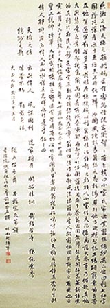 絖本肉筆・・縦140cm、横52cm 「林南軒拝草」の下に、陰刻「林正躬印」と陽 刻「南軒」の落款が押されている。林南軒は 九州の人で、名は正躬、号を南軒と称し、明 治期に活躍した能書家の漢学者で、『日本 政記考証』(明治7年)・『私用文之教』(明治 8年)・『大東烈女伝』(明治17年)・『荘子和 解』(明治42年、菊池晩香共訳)等の書籍を 公刊している。尚、本品は真名井純一翁の 碑文が書かれているが、この碑文の撰文者 は、明治期の殖産興業政策の実践者で、「 布衣の農相」と称された、薩摩の前田正名で ある。 |