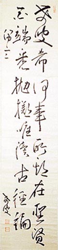 紙本肉筆・・縦133.5cm、横30.4cm 「老叟」の下に、陰刻「勝機」と陽刻「子勿」の落款 が押されている。秋山罷齋は桑名の人で、名は 断・勝機、字は子勿、号を罷斎・蕉窓・ゴウ(虫+ 豪)山などと称し、昌平黌に学んで桑名藩に仕え た、儒者秋山自賁堂の子で、家学を受けて経義 を専攻し、大義名分を子弟に教授した漢学者であ る。尚、大東文化大図書館には、罷齋の江戸末 写本の『周易本義序例筆記』が所蔵されている。 |