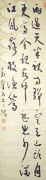 紙本肉筆・・縦149cm、横40cm 「東望居士公張」の下に、陰刻回印「清公張印」と陽 刻「東望居士」の落款が押されている。清岡東望は 土佐の人で、名は公張、号を東望と称し、野根山殉 難二十三士の首領清岡道之助の弟で、伊勢に遊学 して土井ゴウ牙の門で経史を学び、勤王の志が厚く て藩命に因り三条実美の衛士となり、維新後は各地 の権知事や県令を歴任し、司法省に出仕した後に 貴族院議員や枢密顧問官を務めた政治家である。 |