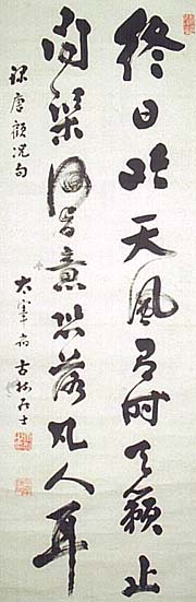 紙本肉筆・・縦140cm、横48cm 「古梅居士」の横に陰刻「康文之印」と陽刻「太宰府人」 の落款が押されている。宮小路浩潮は筑前の人で、名 は康文、号を浩潮・古梅などと称し、嘉永年間(1848〜 1852)に比叡山で天台の学を修め、権大僧正となって 帰郷し、太宰府で菅公廟の祭酒となり、大阿闍梨・大和 尚に進むも還俗した人で、幼少より晋唐以来の諸名家や 我が国の名筆を学び、特に空海の書法を究めた名筆家 として知られた書家で、平安遷都1100年記念祭には特 に下命に因って、平安神宮応天門の扁額を揮毫している し、また明治28年に建碑された富岡神社の横綱力士碑 の揮毫も行っている。 |
