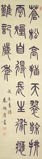 絹本肉筆・・縦125.5cm、横34cm 「春湖孝書」の下に、陰刻「安本孝和」と陽刻「子 温」の落款が押されている。安本春湖は東京の人 で、名は孝和、字は子温、号を春湖・知足庵など と称し、曾祖父以来三代に渉って能書家として知 れらた家に生まれ、その家学を受けて幼少より書 を学び、更に西川春洞の門に入って研鑽を積み、 各書体を善くして巧緻な書風を以って知られた書 家で、『篆書体字典』『篆書小字典』等の本を公刊 している。 |