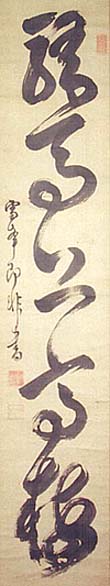 紙本肉筆・・縦68cm、横23cm 「黄檗即非書」の下に、陰刻「如一之印」と陽刻「即非」 の落款が押されている。関防印は陰刻「臨済正宗」で ある。即非如一は福建の人で、法名は如一、道号を即 非と称し、黄檗山に入って隠元より印可を受け、明暦 三年(1657)に渡来して長崎の嵩福寺に入り、次いで 宇治の黄檗山に登り、帰国せんとするも小倉藩主小 笠原忠真の要請に因り福聚寺を開山し、その後嵩福 寺に隠居して入寂した、臨済宗黄檗禅の帰化僧で、黄 小倉の旧家に伝わっていた品である。 |