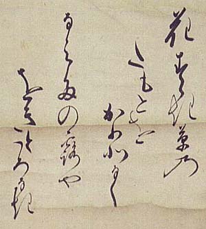 紙本肉筆・・縦26cm、横26cm 細川三齋は京の人で、名は忠興、号を三斎と称し、戦国武 将で文化人であった細川幽斎の子で、肥後細川家の基礎 を築いた戦国大名であるが、和歌・能楽・書画等に通じた 当代一流の文化人でもあり、特に茶道に関しては、利休七 哲の一人であり三斎流の開祖でもある。本品は、花押も署 名も無く、代々細川三齋の作と伝えられている、「伝」の品 である。尚、忠興の妻が明智光秀の娘で、有名な細川ガラ シャである。 |