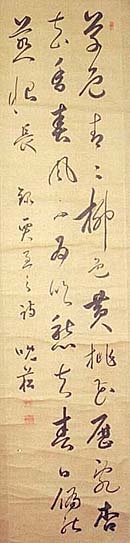 紙本肉筆・・縦135cm、横30cm 「晩菘」の下に、陽刻「樂山樂水」と陰刻回印「真元曹 印」の落款が押されている。真下晩菘は甲斐の人で 、本姓は益田氏、名は穆、字は元曹、号を晩菘と称 し、甲斐大藤村の農民の子であるが、江戸に出て代 官手代となり、幕臣真下家を継いで甲州金山奉行と なり、次いで陸軍奉行並支配となるも職を辞し、横浜 に漢学の私塾融貫塾を開き、子弟の育成に従事して 書の世界に遊んだ儒者で、一般人士から博徒に至 るまでその人柄が慕われ、多くの人材を養成してい るが、樋口一葉の父則義も彼を頼った一人である。 現在、甲州市の慈雲寺には松平破天荒斎(康国)の 撰文に係る碑文が、残されている。 |