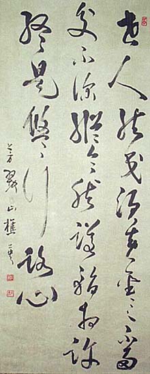紙本肉筆・・縦113cm、横49cm 「芳翠山樵英」の下に、陰刻「松英」と陽刻「子義」の落款 が押されている。松本芳翠は愛媛の人で、名は静春、通 藤雪竹らに師事した書家で、雑誌『書海』を発行した書 海社理事長で、日本芸術院賞受賞者である。尚、本品 は所謂「伝」である。 2008年に入ってこの手の「伝」作品が氾濫している。 になる作品で、部分的にはよく似ているものの、全体的 には似て非なる品である。 |