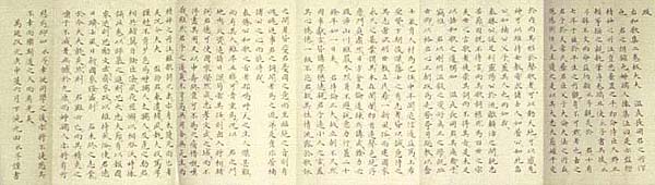 紙本肉筆・・縦25.4cm、横95.3cm 「萬延改元庚申夏六月下浣元田永孚謹書」と有れば、1860年43歳の時の作である。元田 東野は肥後の人で、名は永孚、字子中、号を東野・東皐・茶陽・猿岳などと称し、藩校時習館 に学んで熊本藩の京都留守居・高瀬町奉行などを務めた後、隠退して私塾を開き講説に従事 しているが、維新後は明治天皇の傅となって侍講を兼ね、宮中顧問官や枢密顧問官を歴任 し、教育勅語の草案に与など、明治天皇の絶大な信任を得た儒者である。 |