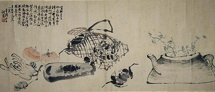 紙本肉筆・・縦46cm、横108cm 茶壺として有名な曼生壺と果物を描き、養生を説いた図である。月如世二兄大人、一笑、青萍譚磨の署名の 下に、陰刻「西屏譚磨」の落款が押されている。末松青萍は豊前の人で、名は謙澄、字は受卿、号を青萍と 称し、村上詩仏に師事して文辞を善くし、国学・和歌にも通じ、明治政府の官僚として活躍し、貴族院議員に 選ばれ、逓信大臣・枢密顧問官・韓国皇太子傅育係などを歴任し、子爵を授けられた人で、漢詩人としても 有名である。ちなみに彼の夫人は伊藤博文の娘である。 |
