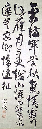 紙本肉筆・・縦137.5cm、横53cm 「総明」の下に、陰刻「鵜澤総明」と陽刻「春滌」の落 款が押されている。鵜澤春滌は千葉の人で、名は 総明、号を春滌と称し、東京帝大法科を卒業後に弁 護士となるが、次いで衆議院議員や貴族院議員を 歴任し、極東国際軍事裁判で日本側弁護団長を務 め、その後明治大学総長となった法律学者の政治 家である。尚、彼は大東文化学院の法律学教授を 務めているが、同時に大東文化協会第8代会頭や 大東文化学院第4代・5代・9代・12代総長も務め、 更に大東文化学院初代理事長も務めている。 |