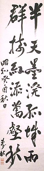 紙本肉筆・・縦142.5cm、横39.5cm 「麦秋」の下に、陰刻「駒井徳三」と陽刻「麦秋」の落 款が押されている。駒井麦秋は滋賀の人で、名は 徳三、号を麦秋と称し、杉浦重剛の塾に学んで中国 に関心を持ち、東北帝大卒業後に満鉄に入社し、そ の後郭松齡の満洲独立運動に参加し、満州国が建 国されると初代国務院総務長官に就任し、次いで参 議府参議となった官僚であるが、宝塚には私塾康 徳学院も開校しており、戦後は実業界に身を置いて いる。尚、彼は「ジンギスカン鍋」の命名者としても知 られている。 |