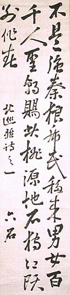 紙本肉筆・・縦130cm、横31cm 「六石」の署名が有る。陸奥六石は紀州の人で、 名は宗光、号を六石と称し、幼にして国学者でも あった父から学び、江戸に出て安井息軒に学び、 坂本龍馬や桂小五郎らと交流し、勝海舟の海援 隊に入り、維新後は県令や知事を務めるが、西 南戦争に関わって投獄され、出獄後は欧州に留 学し、帰国後外務省に出仕して駐米公使を務め、 農商務大臣や外務大臣を歴任した外交官にして 政治家である。 |