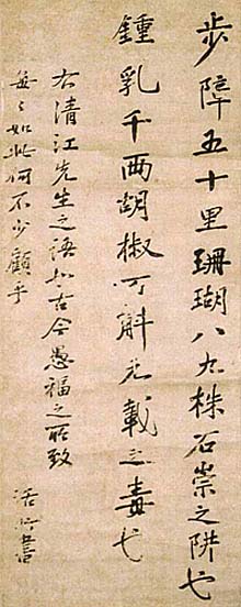 紙本肉筆・・縦67cm、横25cm 「活所」の下に、陽刻の落款(摩滅)が押されてい る。那波活所は播磨の人で、名は觚、字は道円、 号を活所と称し、豪商の生まれであるが18歳で 京に出て藤原惺窩の門に学び、惺窩門の四天王 (林羅山・松永尺五・堀杏庵)と称され、初め熊本 藩に仕え、次いで紀州藩の儒臣となった儒者で、 彼が公刊した木活字白氏文集は、北宋刊本の旧 を伝えており、「道円本白氏文集」と称され四部叢 刊に収められている。 |
