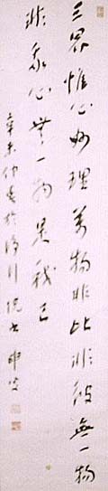 紙本肉筆・・縦126.5cm、横29.8cm 「申叟」の下に、陰刻「浄行院主」と陽刻「三申居 士」の落款が押されている。小泉三申は静岡の人 で、名は策太郎、号を三申と称し、若くして村上浪 六に師事し幸徳秋水と親交を結び、静岡日報や 自由新聞の記者として活躍した後、九州新聞や 経済新聞の社長を務め、その後衆議院議員とな った文人政治家で、『由比正雪』『懐往時談』等の 本を公刊している。尚、彼の七男が日本画家の 小泉淳作で、八男が俳優の小泉博である。 |