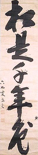 紙本肉筆・・縦88.2cm、横22.2cm 「六如叟書之」の下に、陰刻「北五巌」と陽刻「枯木 ?釦の落款が押されている。慈周六如は近江の人 で、俗姓は井苗村氏、法名は慈周、法号は六如、号 を葛原・白梅・無着庵などと称し、11歳で天台宗の 慈門に就いて仏学を学び、野村東皐や宮瀬龍門ら に就いて詩文を学び、晩年は京に隠棲して諸名流と 詩社を結び、宋詩唱導の先駆者となり、更に日本の 和歌や俳諧と接近して、詩的感性の等価現象を示 した漢詩人の学僧である。 |