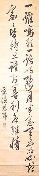 紙本肉筆・・縦117.4cm、横29.7cm 「藕コウ(さんずい+黄)林アキラ(火+韋)」の下に、陰刻「アキラ(光 +韋」と陽刻「弸仲氏」の落款が押されている。林復斎は江戸の 人で、林家宗家第8代大学頭林述斎の第六子で、名はアキラ(火 +韋)、字は弸仲、号を復齋・梧南・藕コウ(さんずい+黄)などと 称し、初め林家の支族を嗣ぐが、後に宗家(林家第11代)に復 し、松崎慊堂に師事して大学頭に任ぜられた儒者である。 |