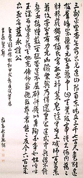 紙本肉筆・・縦138cm、横66cm 「敬軒秋月胤繼」の下に、陰刻「秋月胤繼」と陽 刻「敬軒」の落款が押されている。秋月敬軒は 鹿島の人で、本姓は塚原氏、名は胤継、号を 敬軒と称し、鹿島神宮宮司塚原家の次男で、 初め叔父である山岡鉄舟の養子となるが、そ の後に維新の儒者である秋月胤永の長女の婿 養子となって秋月姓を名乗り、胤永より漢学の 薫陶を受けて熊本第五高等学校教授となり、 朱子学の泰斗と称された漢学者である。 |