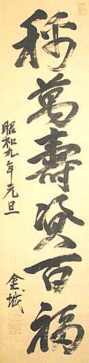 絹本肉筆・・縦127.8cm、横36.6cm 「金城」の下に、陰刻「大瀬甚印」と「金城」の落款が 押されている。大瀬金城は加賀の人で、名は甚太 郎、号を金城と称し、加賀藩士大瀬直温の子で、上 京して進文学舎で学んだ後、東京帝大哲学科に入 り大学院に進んで心理学を学び、卒業後は第五高 等中学校に赴任し、在任中に文部省から派遣され て欧州に留学し、帰国後に高等師範学校教授とな り、次いで第二代東京文理科大学学長となった、西 洋教育史学者である。 |