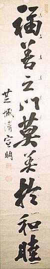 紙本肉筆・・縦136cm、横28cm 「芝城清宣明」の下に、陰刻「清原宣明」と陽刻丸印「 北園」の落款が押されている。清原芝城は京の人で、 名は宣明、号を芝城・北園などと称し、正三位の位に 在った公卿で、『女四書芸文図会』(天保六年)・『門跡 伝』(弘化二年)・『鍾珠驚眼』(嘉永六年)等の書籍を 公刊しており、狭山市の県指定文化財である「掘兼之 井」に有る、天保十三年(1842)に立てられた石碑に は、宣明の七言絶句の漢詩が刻されているが、生卒 等詳細は不明である。 |