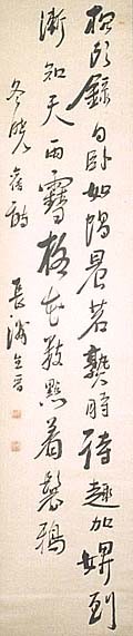 紙本肉筆・・縦135cm、横29cm 「長洲生晉」の下に、陰刻「長洲」と「晩得」の落款が 押されている。城長洲は紀州の人で、名は晉、字は 康卿・陰平、号を長洲・政堂などと称し、伊予に住し て医を業とし、佐藤一斎や大窪詩仏らに学んだ漢詩 人で、徳永梅翁が著した教訓書である『習性邇言』な る本に、文久二年(1862)の序文を寄せており、更 に紀州の隠士長洲城晉なる人物が、安政七年に広 島の宮原村の里正青盛家を訪ねた記録が残ってお り、同時に「烏小島」等の漢詩も残している。 |