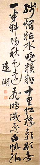 紙本肉筆・・縦137cm、横33cm 「遠湖」の下に、陰刻「周平之印」と「遠湖釣る者」 の落款が押されている。内田遠湖は遠州の人で 、名は周平、字は仲準、号を遠湖・帆影子などと 称し、幼にして読書を好み、初め東京帝大医科で 医学を修めるが、文科に転じて東西の哲学等を し、熊本第五高校で教鞭を執るや、肥前の楠本 碩水に従って崎門(山崎闇斎)の学を修め、帰京 後は東洋大学や慶応大学等で教えた漢学者で、 当代随一の崎門学者と称されている。亦彼は「大 東文化協会」初代理事であると同時に、大東文化 学院教授でもあり、『近思録』や『大学』『中庸』等 を講じている。 |