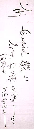 紙本肉筆・・縦136cm、横33.3cm 「一如洞主武田豊四郎」の下に、陽刻圖象印の落 款が押されている。武田一如洞は、名は豊四郎、 号を一如洞と称し、真言宗の寺院の生まれである が、早稲田大学に入学して「汎大乗主義」を唱え、 早大教授となって「早大仏教青年会」の初代会長 を務め、『民間伝承より観たる聖空海』『支那画の 研究』『古代印度の文化』等の著書を公刊した、仏 教学・民俗学の研究者であるが、同時に「一如洞」 なる仏教集団を作り、ターバンを巻いた印度風衣 裳を着け、4月8日の花祭りに日比谷辺り行列す ることでも有名であった、と言われている。亦、彼 は大東文化協会の評議員も務め、大正13年から 14年にかけて、大東文化学院設立宣伝の講演も 多く行っている。 |