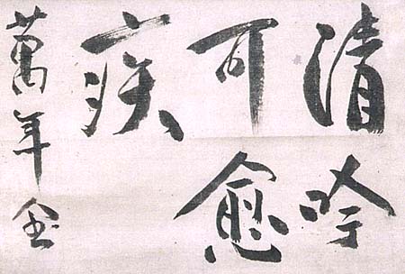紙本肉筆・・縦26cm、横38cm 「萬年」の署名が有る。三宅石菴は京の人で、名は正名、字は実父、号 を石菴・万年・泉石などと称し、崎門学派の儒者浅見絅斎の門人で、初 め江戸で次いで大阪で講説に従事し、石菴の門人であった豪商道明寺 屋吉左衛門ら五人の富商と儒者の中井甃菴らとが相談し、尼が崎の 地に大阪学問所つまり懐徳堂を建てるが、そこの初代祭酒(学主)に迎 えられて朱子学を講じたのが石菴で、彼は書と和歌にも秀でた儒者で 水戸藩に仕えた儒者三宅観瀾の兄である。 |