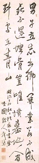 絹本肉筆・・縦95.2cm、横24.3cm 「杏圃散人戯塗」の下に、陰刻「山本有武」と陽刻「止 卿」の落款が押されている。山本杏圃は信州の人で、 名は有武、字は止卿、号を杏圃と称し、小諸藩に仕え た儒者で、明治15年に設立された小諸施薬院の共同 設立者の一人である、医師の加川松軒の漢学の師( 明治5年以前)であるが、詳細は不明である。尚、本品 は「明治乙卯秋日於藕香書屋」とあれば、明治12年( 1879)の品である。 |