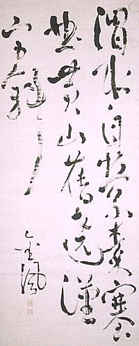 紙本肉筆・・縦134.5cm、横55.8cm 「金風」の下に、陰刻「江衍私印」と陽刻「祖宗江 納言」の落款が押されている。長井金風は秋田の 人で、名は行・衍、号を金風・雁門・欝斎などと称 し、漢学を中村敬宇に、和歌を佐々木信綱に学 び、秋田魁新報主筆を務め、『周易之研究』『周 易秘説』『万葉集評釈』等々を公刊した東洋史学 者で、同時にジャーナリスト・郷土史家・歌人でも ある。日本近代文学館には、1967年に村上早 苗氏から寄贈された、「長井金風コレクション」(原 稿・書簡・筆墨等115点)が、収められている。 |