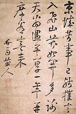 紙本肉筆・・縦29.3cm、横21.5cm 「竹雨?人」の下に、陰陽下駄印刻「錫胤求卿」の落款が 押されている。中島可庵は阿波の人で、名は錫胤、字は 求卿、号を可庵・無外・竹雨などと称し、初め岩本贅庵ら に漢学を学び、次いで京の中島棕隠の門に学んで棕隠 の養子となり、水戸の儒官に招かれた儒者で、勤王の志 が厚く文久三年の京の足利木像事件に関与して幕吏に 追われ、阿波藩邸内に捕らえられるが、維新後は兵庫・ 山梨等の県知事を歴任している。 |
