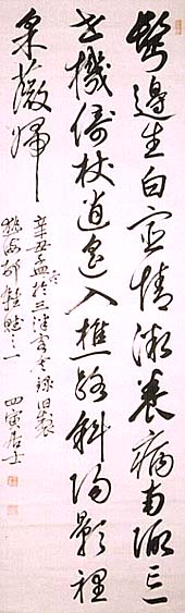 紙本肉筆・・縦133cm、横41.7cm 「四寅居士」の下に、陰刻「三良之印」と陽刻「四寅居 士」の落款が押されている。尾崎四寅は京の人で、名 は盛茂、通称は三良、号を四寅と称し、公卿の三条実 美に仕え、長崎で坂本龍馬らと親交を結び、英国に留 学して法律を学び、帰国後は太政官に出仕して法制 整備を行い、法制局長・貴族院議員・宮中顧問官等を 務めた官僚で、「憲政の神様」と称された尾崎行雄の 岳父でもある。 |