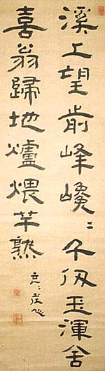紙本肉筆・・縦110cm、横34cm 「玄々老人」の横に、陰刻「田邊伯表」と「玄々庵主」の 落款が押されている。田邊玄玄は京の人で、名は憲・ 祐憲、通称は飛騨、字は伯表、号を玄々・楓竹・松園・ 東田居などと称し、代々京の東寺の坊官で得度して良 休と称して法眼の位に叙せられ、武元登々庵らに師事 して大師流の書と篆刻を学び、京の陶芸家青木木米 らと交流して瓷印に興味を持ち、自ら瓷印を制作して 一家を成した篆刻家で、彼の著した『玄々瓷印譜』に は、当時の名流頼山陽・佐藤一斎・大窪詩仏・篠崎小 竹・市河米庵・巻菱湖・貫名海屋ら四十数名が、序文 ・題跋を寄せている。 |