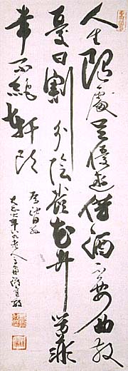 紙本肉筆・・縦115cm、横40cm 「雪窓渡邊敏」の下に、陰刻「渡邊敏印」と陽刻「 雪窓」の落款が押されている。渡邊雪窓は陸奥の 人で、名は敏、号を雪窓と称し、本来は浅岡姓で あるが、戊辰戦争従軍後に母方の渡辺姓を継ぎ 、東京師範学校を卒業して長野県内の教員を経 て長野高等女学校の初代校長となり、女子体育 や社会人教育の普及に尽力し、また近代登山の 指導にも努めた教育家で、長野県の「近代教育 の祖」と称されている。 |