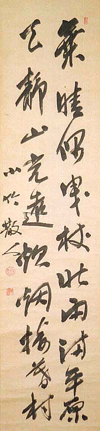 紙本肉筆・・縦133cm、横30cm 「乗晴偶曳杖、此雨満平原、天静山光遠、炊烟接暮村」 の詩の後に「小竹散人」とあり、陽刻丸印「弼(?)」と陰 刻「大路氏」の落款が押されている。篠崎小竹は豊後の 人で、名は弼、字は承弼、号を小竹・畏堂・退庵などと 称し、本姓は加藤氏である。彼は、九歳の時に篠崎三 島に学んでその養子となり、十九歳で江戸に遊び尾藤 二洲の学を聞き、一度帰阪後に再び江戸に出て古賀精 里に学び、その後大阪に帰って朱子学を奉じ、父三島 に代わって門弟に教授した儒者で、同時に詩文と書で も名高かった人である。本品は、軸裏に「篠崎小竹五言 絶句」と書かれているが、寡聞にしてこの書に押されて いるような印象は見た事が無く、また彼の字に「大路」 が有った事も知らない。因って、「伝」の作としておく。 |