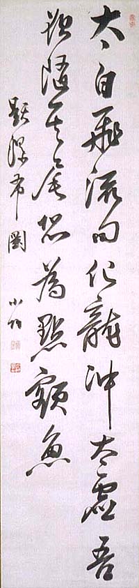 紙本肉筆・・縦123.2cm、横29.4cm 「題瀑布圖、小竹」の下に、陽刻の「承弼」と陰刻の「小 竹學人」の落款が押されている。篠崎小竹は豊後の人 で、名は弼、字は承弼、号を小竹・畏堂・退庵などと称 し、本姓は加藤氏である。彼は、九歳の時に篠崎三島 に学んでその養子となり、十九歳で江戸に遊び尾藤二 洲の学を聞き、一度帰阪後に再び江戸に出て古賀精 里に学び、その後大阪に帰って朱子学を奉じ、父三島 に代わって門弟に教授した儒者で、同時に詩文と書で も名高かった人である。 |
