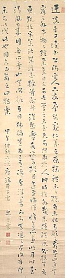 紙本肉筆・・縦108cm、横26.6cm 「木士雲」の下に、陰刻「友風印字士雲号環山」と陽 刻「別號玉堂」の落款が押されている。植木環山は 播磨の人で、名は友風、字士雲、号を環山・玉堂・ 班竹などと称し、祖父の代よりの医者であるが、漢 詩と書を猪飼敬所や巖垣松笛らに学び、更に和歌 を大国隆正に学び、医業の傍ら家塾学半館を開き、 漢学・和歌・書を教授して多数の門弟を養成し、儒 者の安積艮斎や篠崎小竹らと交流を重ねた儒医で ある。 |