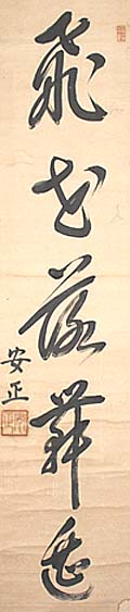 紙本肉筆・・縦133cm、横27.2cm 「安正」の下に、陽刻「安正」の落款が押され ている。福島安正は信濃の人で、名を安正と 言い、松本藩士福島安広の長男で、江戸に 出て幕府の講武所で洋式兵学を学び、次い で開成学校で英語を学んだ後、陸軍省に入 って士官登用試験に合格し、情報将校として ヨーロッパ・ロシア・シベリア・中国等を実地 調査して活躍し、参謀次長や関東都督等を 歴任して、陸軍大将となった軍人である。 |