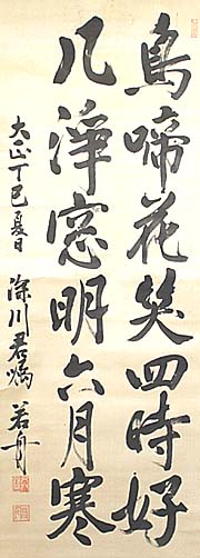 絖本肉筆・・縦128.5cm、横44.5cm 「若舟」の下に、陰刻「又八郎印」と陽刻「若舟」の落款 が押されている。名和若舟は若狭の人で、名は又八郎 、号を若舟と称し、小浜藩士武久久三の子であるが、 名和家の養子となり、海軍兵学校を卒業して巡洋艦の 分隊長・戦艦の副長や艦長・軍令部参謀等を歴任し、 第三艦隊司令官や横須賀鎮守府長官等を務めて、海 軍大將となった軍人で、加藤定吉海軍大將とは兵学校 の同期である。 |