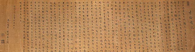 絹本肉筆・・縦33.8cm、横128cm 「東肥僑居 笠間益三識」の横に、陰刻「笠間益三」と陽刻「十六松園外史」の落款が押されている。 笠間梧園は筑後の人で、名は広延、通称は益三、号を梧園・十六松園などと称し、初め柳川藩校伝 習館に学び、次いで江戸の昌平嚳に学び、更に慶應義塾に転じて洋学を修め、兵部省勤務の後に、 第五高等学校教授となった漢学者である。本品は、伝習館での師である大屋先生の書楼に関する銘 文で、『有餘樓記』と題されている。 |
