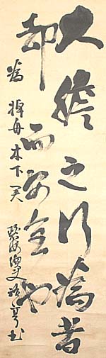 紙本肉筆・・縦130.5cm、横35cm 「碧海漁史祐亨書」の署名が有る。伊東碧海は薩摩の 人で、名は祐亨、号を碧海と称し、薩摩藩士伊東祐典 の四男で、初め藩の開成所で英学を学び、次いで江 川英龍に就いて砲術を学び、更に神戸海軍操練所で 坂本龍馬らと航海術を学び、戊辰戦争では幕府海軍 と戦い、維新後は海軍に入って戦艦の艦長を歴任し、 日清戦争に際しては日本海軍の初代連合艦隊司令長 官となり、清国北洋艦隊提督丁汝昌の遺体を故国に 送還すると言う行為で、世界にその礼節を驚嘆せしめ 、日露戦争では軍令部長を務め、元帥海軍大将となっ た軍人である。 |