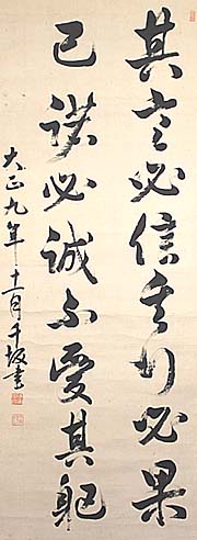 絹本肉筆・・縦129cm、横49.5cm 「千坂書」の下に、陰刻「海軍中將」と陽刻「千坂 智次郎」の落款が押されている。千坂智次郎は山 形の人で、名を智次郎と言い、米沢藩士千坂高 雅の次男で、海軍兵学校(第14期で、小説「坂の 上の雲」の主人公秋山真之の一期先輩)を卒業 後、日清戦争では戦艦扶桑の分隊長、日露戦争 では戦艦初瀬の航海長として出征し、その後戦艦 大和の艦長等を務め、更に舞鶴鎮守府参謀長・ 第2戦隊司令官・鎮海要港部司令官等を歴任し、 海軍中将となった軍人である。 |