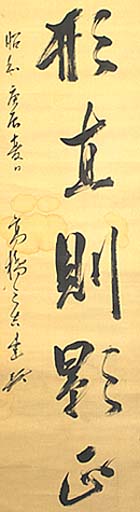 絹本肉筆・・縦129cm、横40cm 「高橋三吉書」の署名と花押が書かれている。高 橋三吉は東京の人で、名は三吉、号を青山と称し 、海軍兵学校を卒業して、日露戦争では戦艦敷 島の分隊長として出征し、その後軍令部第二課 長・戦艦艦長・連合艦隊参謀長・連合艦隊第一航 空戦隊司令官・軍令部次長・第二艦隊司令長官・ 連合艦隊司令長官等を歴任した、海軍大将の軍 人であるが、花柳界で非常にもてた事から「三吉 姐さん」と愛称され、また芸術を好み油絵や書画 にも堪能である。尚、終戦直後にサンドイッチマン をしていた三吉の長男が、俳優鶴田が歌った歌 謡曲「街のサンドイッチマン」のモデルだと言われ ている。 |