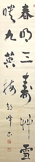 紙本肉筆・・縦133.6cm、横c31.2m 「朝峰」の下に、陰刻「青木信印」と陽刻「知足盦主 人」の落款が押されている。青木朝峰は水戸の人 で、名は信光 、号を朝峰と称し、松岡藩主中山信 徴の四男で、麻田藩主青木重義の養子となり、学 習院や東京法学院(現、中央大学)で学んだ後、 貴族院議員となって50年近くもその地位を保ち、 最大会派研究会の指導者として活躍した政治家 である。尚、本品は、「北海の太閤」と称された政 治家木下斗南(成太郎)の喜寿の祝いに書かれた 品であり、木下は、大東文化協会の理事も務めて いる。 |