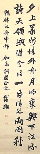 紙本肉筆・・縦131cm、横39cm 「仙坡翰」の下に、陰刻「勝島?印」と陽刻「仙坡」の 落款が押されている。勝島仙坡は備後の人で、名は 仙之助、号を仙坡と称し、初め藩儒吉村斐山に漢学 を学び、その後東京帝大で獣医学を修め、東京農 林学校や東京帝大医学部の教授を歴任し、中央獣 医会長を務めて日本の獣医学会の活動に尽力した 獣医学者であるが、漢詩人としても知られており、 大正六年に知友らに因って出された仙坡の詩集が 『静園詩鈔』である。また昭和2年には、大江敬香・ 本田種竹・森槐南らと交流し、『鐵石詩存』の編集も 行っている。 |