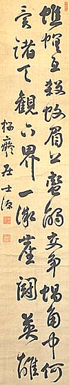 紙本肉筆・・縦133.5cm、横24cm 「櫻痴居士源」の下に、陰刻「福地源」と陽刻「江 左第一風流才子」の落款が押されている。福地櫻 痴は長崎の人で、名は源一郎、号を櫻痴と称し、 初め蘭学を学び、江戸に出て英語を学び、外国 奉行支配の翻訳に従事して文久遣欧使節に参加 し、維新後は江湖新聞を創刊し、大蔵省に出仕し て岩倉使節団に随行し、帰国後は東京日々新聞 の主筆として活躍し、演劇改良運動にも関与して 歌舞伎座を開設し、座付き作者として多数の脚本 も執筆した、ジャーナリストにして作家である。 |