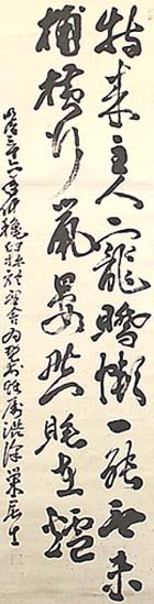 紙本肉筆・・縦129cm、横33.5cm 「渋澤榮居士」の下に、陽刻「???」と「?? ?印」の落款が押されている。渋澤青淵は武蔵の 人で、名は榮一、号を青淵と称し、初め四書五経 を従兄の尾高惇忠に、神道無念流を大川平兵衛 に学び、江戸に出て漢学を海保漁村に、北辰一 刀流を千葉榮次郎に学び、一橋慶喜に仕えて幕 臣となり、維新後は大蔵省に出仕するも大久保利 通らと対立して退官し、第一国立銀行・東京ガス・ 王子製紙・帝国ホテル・京阪電鉄・東京証券取引 所等々、多数の企業の設立に関与した実業家で あり、「日本資本主義の父」と称されている。尚、 彼は大東文化学院設立の第3回協議会の参加 者でもある。 |