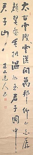 紙本肉筆・・縦135.5cm、横33cm 「達山逸人書」の下に、陰刻「佐倉孫印」と陽刻「達 山居士」の落款が押されている。佐倉達山は二本 松の人で、名は孫三、号を達山と称し、上京して三 島中洲の二松学舎で漢学を学んで塾頭を務めた 後、千葉県警に入り次いで警視庁・司法省を経て 台湾総督初代警察署長となり、帰国後静岡県等 各地の警察を歴任した後、中国福建省武備学堂 教官を務め、帰国して早稲田実業や二松学舎の 教授として漢文を担当した、中国問題評論家の漢 学者で、『山岡鉄舟伝』『台風雑記』『閩風雑記』『 霞城乃太刀風』『徳川の三舟』『時務新論』『警士 之 亀鑑』『達山文稿』等の著作が有る。 |